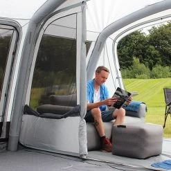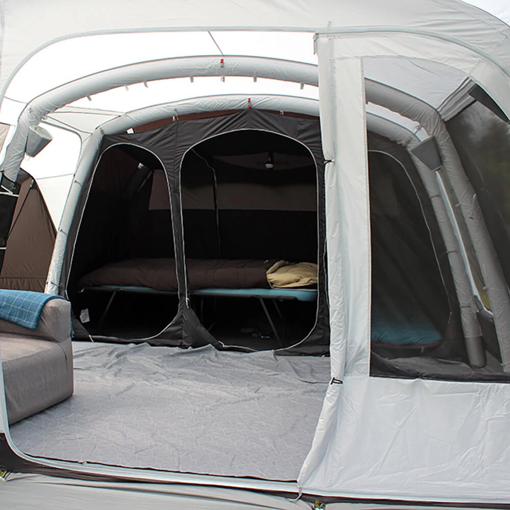 This premium 6+4 berth inflatable family tent includes our exclusive multi-functional double side annexe (registered design). This annexe has been designed to function as either an access point, flexible utility space or a 2-berth sleeping area, which combined with an optional internal 2-berth inner tent increases the total sleeping capacity by 4, allowing a maximum sleeping capacity of 10. The parallel design of the porch area means that only a fraction of extra pitch space is used to the side of the tent. A huge roll-back panel complete with mesh windows separates the internal living space from the front porch, which can be zipped back or totally enclosed; this allows for complete versatility whilst offering ventilation and a pleasant feeling of open space. Utilizing the premium innovations that you would expect from our flagship Airedale collection, the Airedale 6.0SE includes a new double-width patio-style side door with phoenix mesh ventilation, a wardrobe pole, removable ‘bathtub’ front porch groundsheet, and zip-up curtains to name a few. This is the perfect large family tent for those who truly appreciate a spacious camping experience. • 240 HDE high density all-weather lightweight fabric