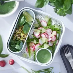 The Black+Blum is more versatile than your standard Tupperware food container, with convenient storage compartments, a leakproof sauce pot and a stainless steel fork. LEAK PROOF: Four clips on the lid, and a wide silicone seal to ensure your food stays in the lunch box! Inspired by the very first lunch box design from Black+Blum. Designed to look like a ceramic bowl, the Lunch Box Original includes an inner container as well as a leak-proof sauce pot with a garnish area in the lid, and a stainless-steel fork.