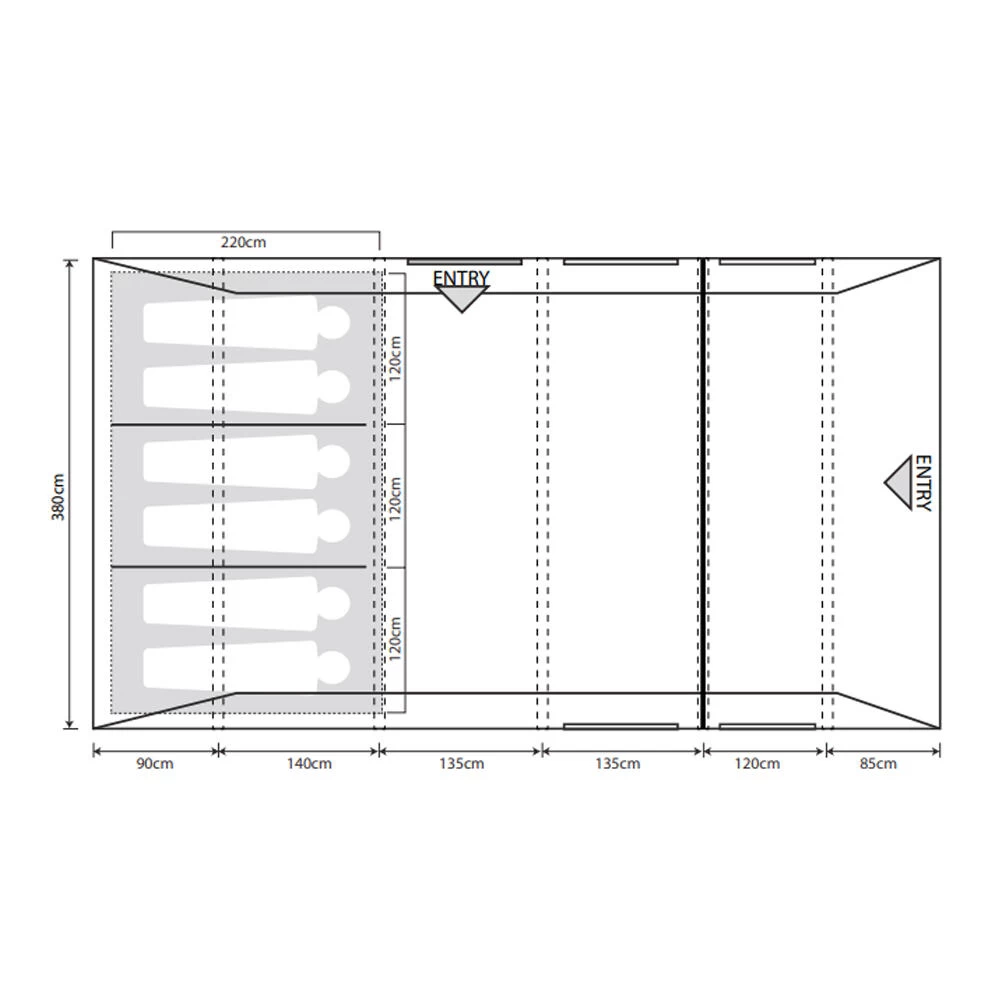 A six berth tunnel tent which represents excellent value ideal for families seeking spacious internal living space on longer camping trips. It is unrivalled in terms of functionality, flexibility, and innovation at this price point. The internal design offers the perfect allocation of usable space for families, split between a generous commune area, a darkened ‘Twilight’ fabric Six-person bedroom that can be split down to a 2/2/2 configuration using the toggle in dividers, and a spacious enclosed front porch area. Our bedroom ventilation system, and ample mesh ventilation fly screen panels combined with crystal-clear window panels maintain an airy internal space and maximise airflow in warmer temperatures. The fully enclosed front porch provides an ideal area for relaxation, cooking, or dining, granting full protection against the elements. Outdoor Revolution understand that comfort has become a prerequisite for the modernized camper, which this tent comes complete with Dura-tread Carpet and a Footprint Groundsheet, adding to the already outstanding value of this family tent. • 120HDE high density all weather lightweight fabric