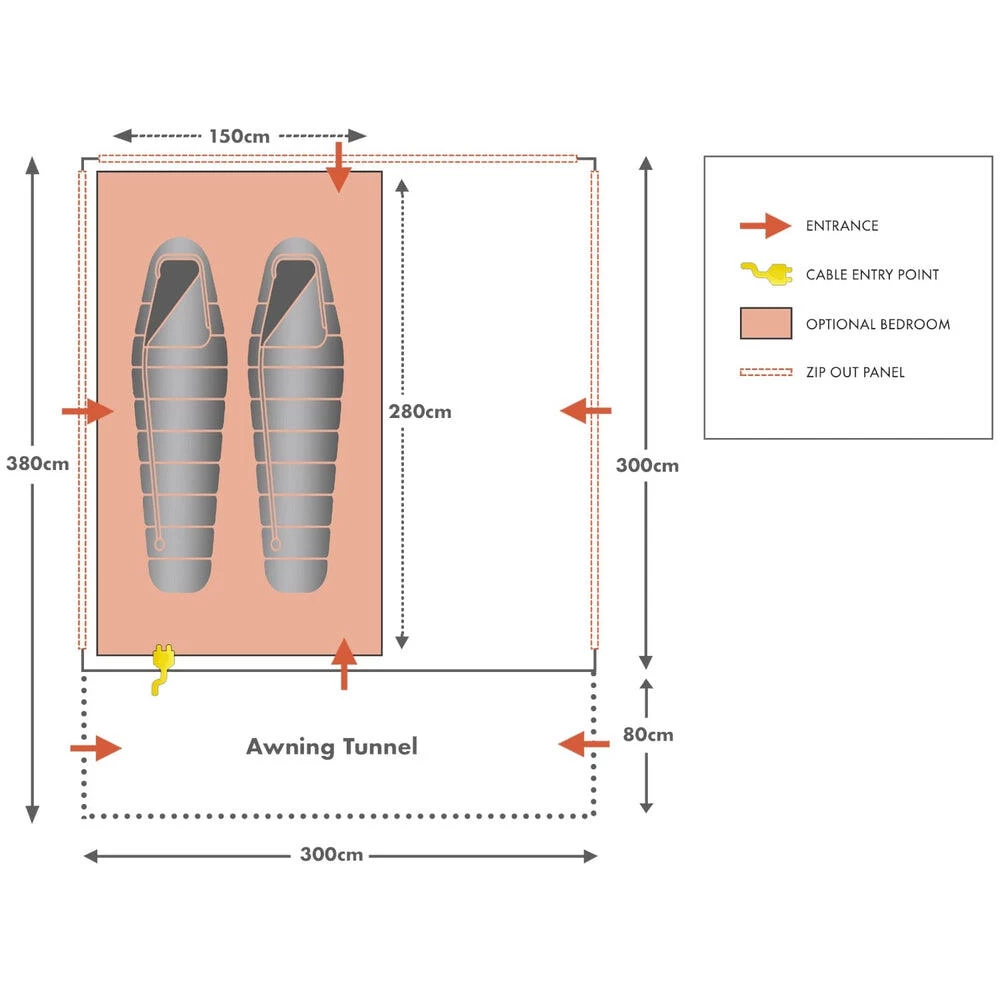 Twin J-Doors on the connection tunnel provide easy accessibility from either side of the awning. AirFlow Doorways are featured via the main doorway and secondary J-Door, with the use of a separately zipped, full-length, integral mesh doorway. This allows the secondary J-Door to be opened fully, exposing a full mesh ventilation panel.