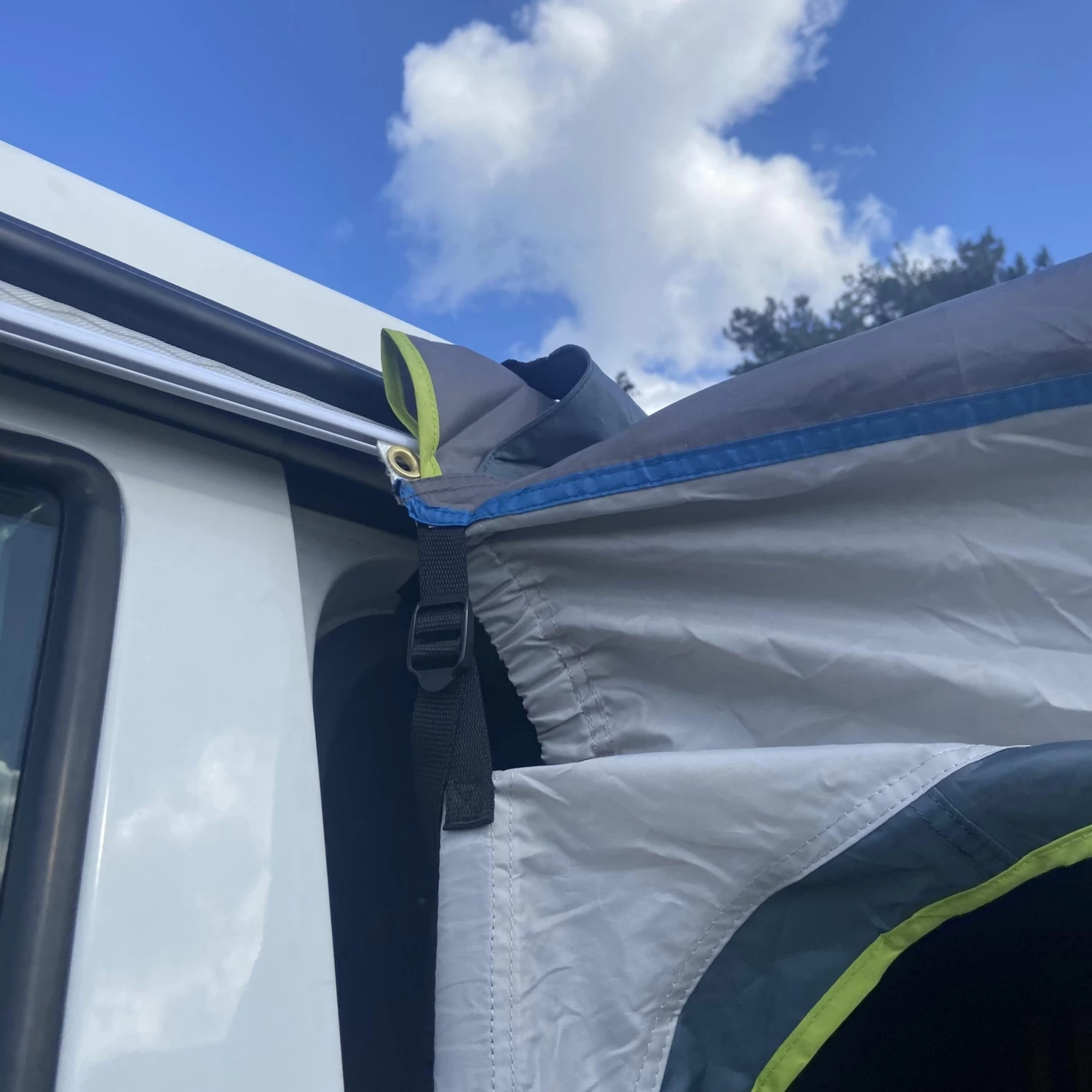The tunnel that connects to the campervan has two access doors, so no need to walk through the awning to get to the van. The sleeping pod has a large inner tent that will fit a double air bed or can be removed to enlarge your living space further.