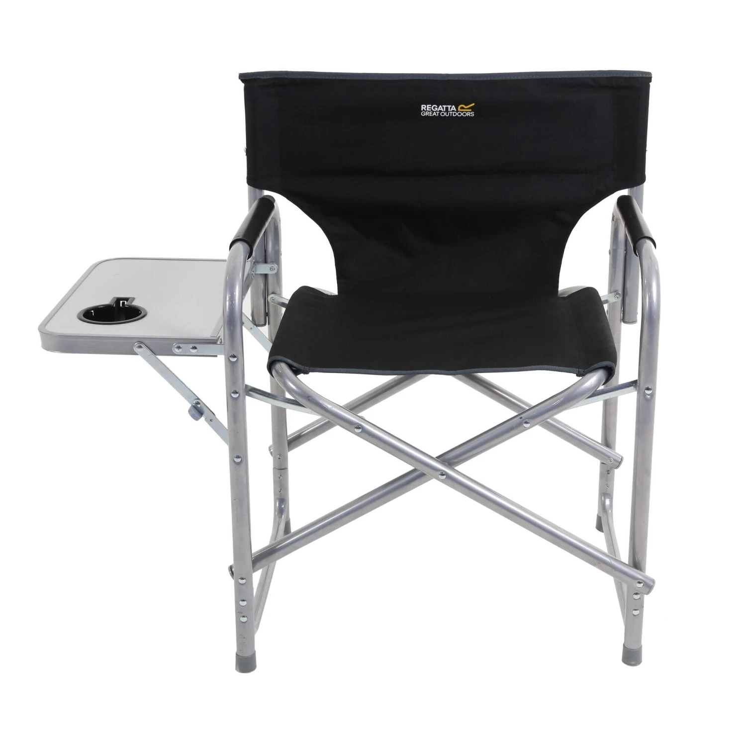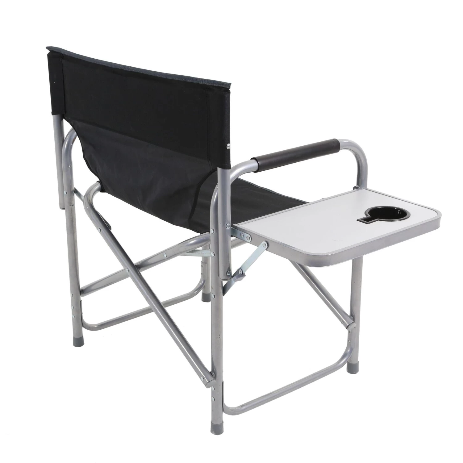 Heavy-duty, steel frame garden / camping chair with a fold-out side table. Folds down flat and packs away.