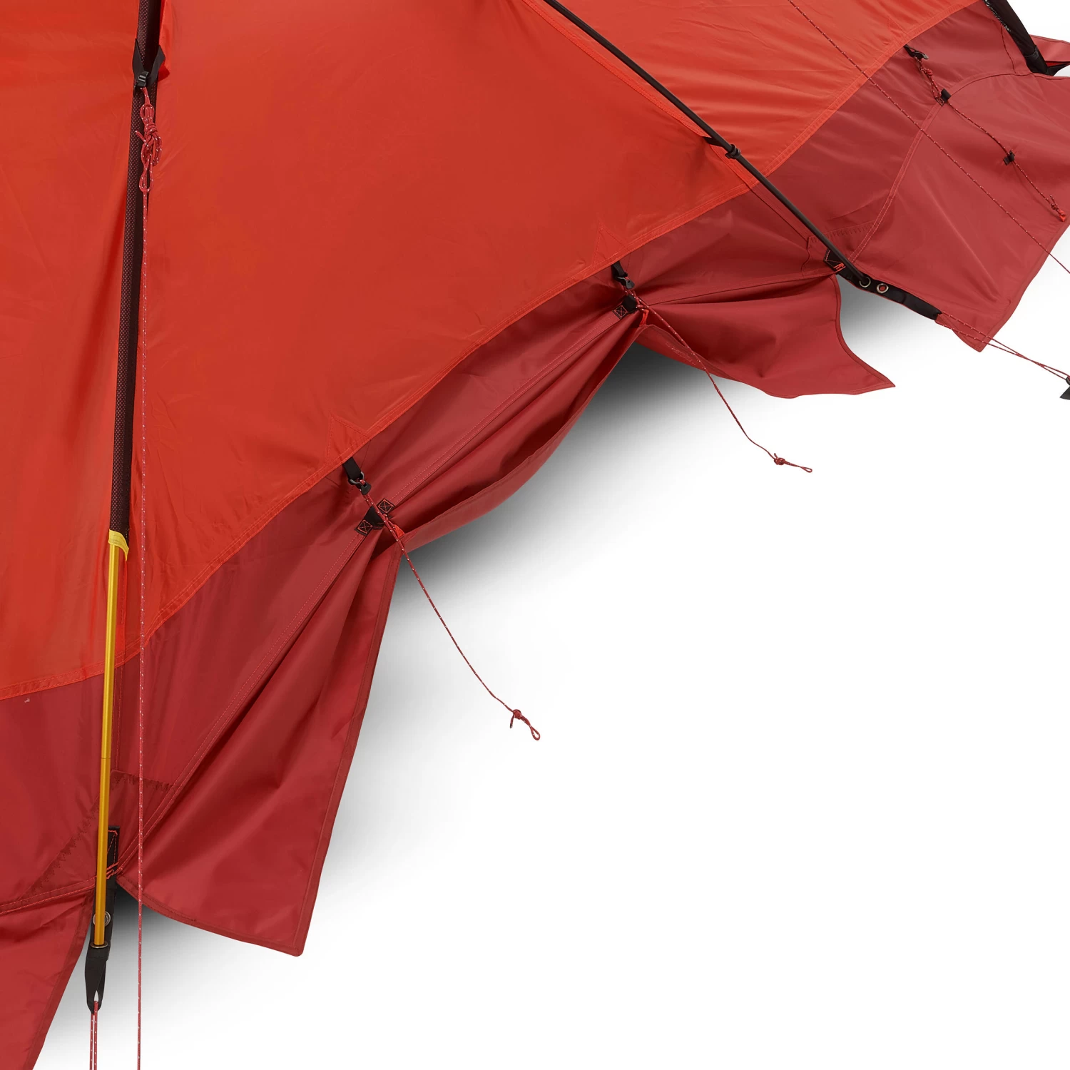 Heat sealed taped seams. Mud flap made from reinforced skirt all around the tent enables you to fix your tent to the ground with snow or stones, preventing wind from getting under the fly sheet.