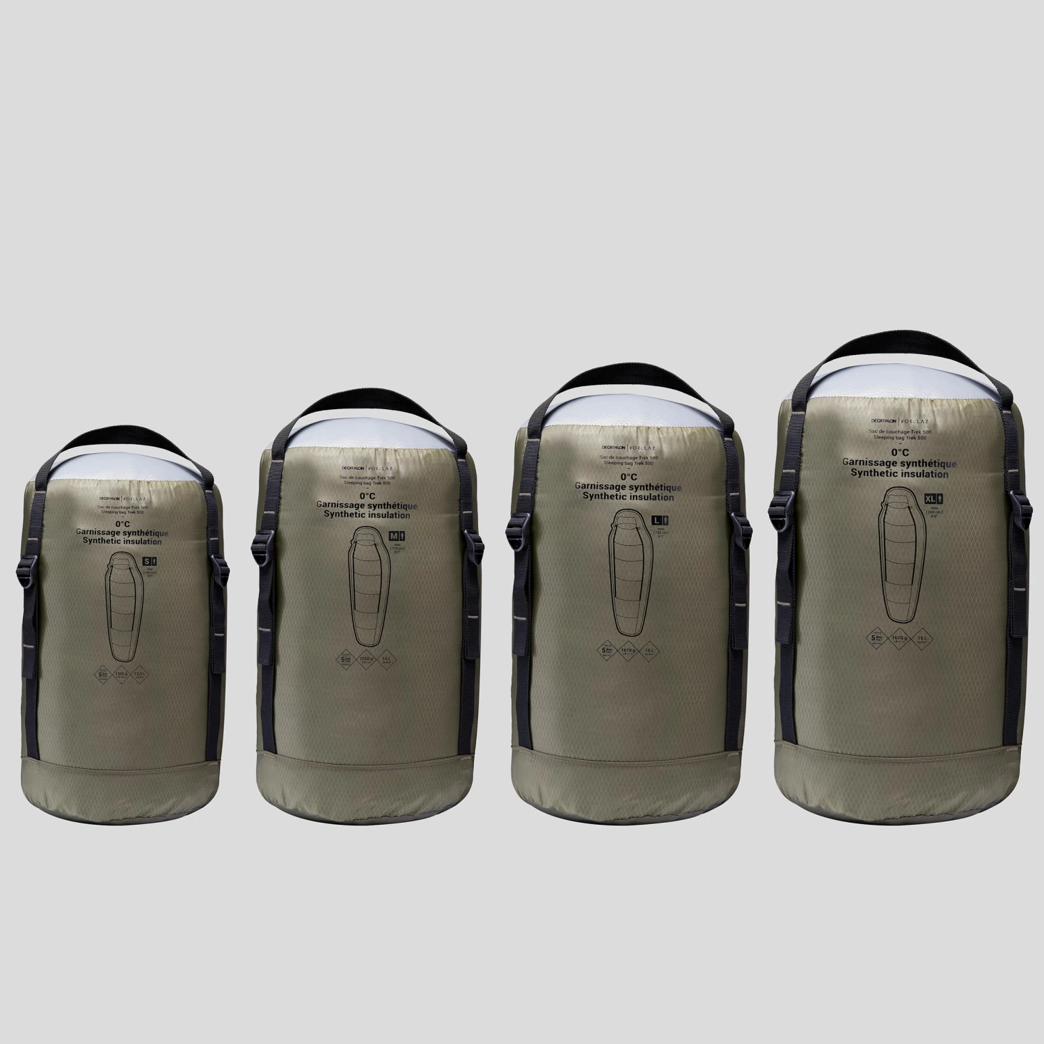 Size L: 1670 g, user from 1.70m to 1.84m tall. Bag dim.: L 42 cm Ø 21.5 cm. Volume 15.2 litres. Size XL: 1790 g, user from 1.85m to 2m tall. Bag dim.: L 42 cm Ø 22.5 cm. Volume 16,7 L. Volume & dimensions may vary according to the compression applied to the product.